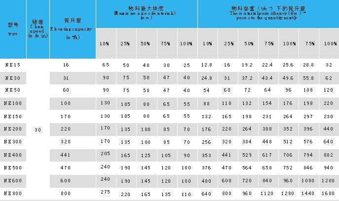 NE系列板鏈?zhǔn)教嵘龣C(jī)共有11種型號:NE15、NE30、NE50、NE100、NE150、NE200、NE300、NE400、NE500、NE600、NE800。